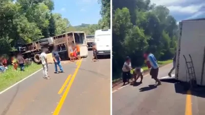 Caminhão carregado com farelo de milho tomba na BR-369, em Cascavel