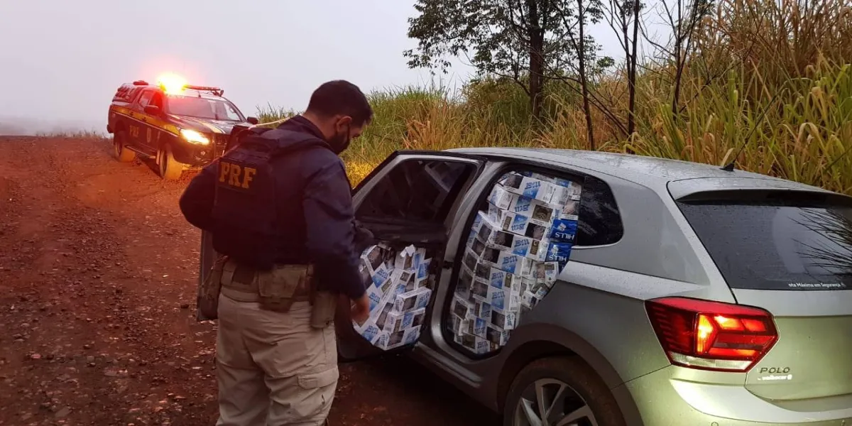 Cerca de 19 mil maços de cigarros contrabandeados do Paraguai foram apreendidos pela Polícia Rodoviária Federal (PRF), no início da manhã desta quinta-feira (06), em uma estrada rural no município de Vera Cruz do Oeste, no Paraná. A carga avaliada em quase 100 mil reais estava em um VW Polo, ano 2019, roubado no dia 1º de abril em Novo Hamburgo, no Rio Grande do Sul.
