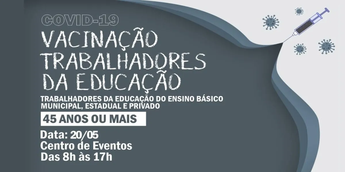 A imunização de professores e trabalhadores da educação acontece até o dia 21 no Centro de Eventos. Será ampliado para pessoas com 45 anos ou mais a partir de quinta-feira (20/5).