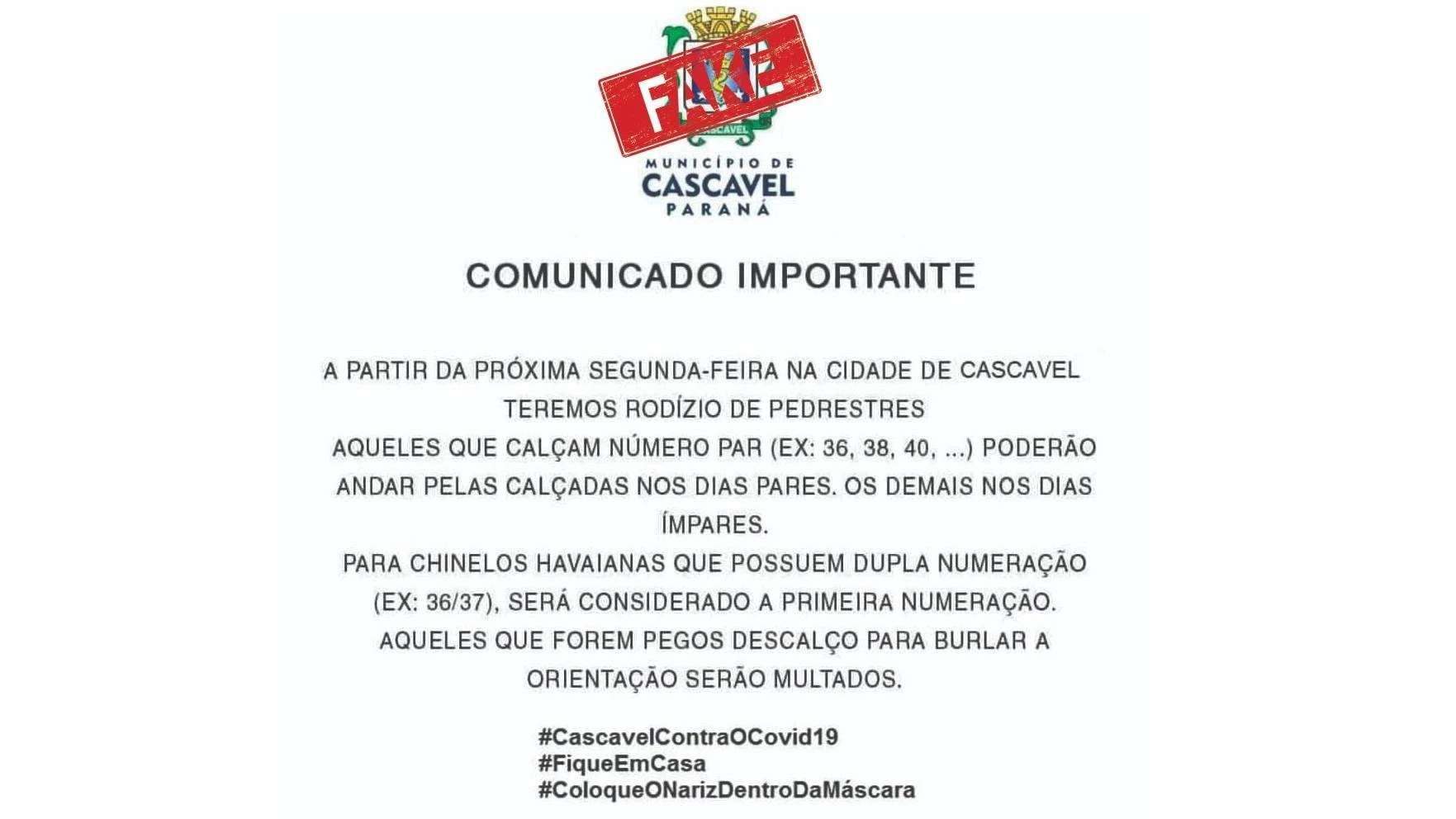 A respeito do comunicado sobre o rodízio por numeração de calçados que está circulando nas redes sociais, claro que é FAKE. Essa foi uma brincadeira leve, mas é preciso ter cuidado. O assunto é sério e alguns fakes induzem pessoas a erro, trazendo riscos à segurança e à saúde pública.
