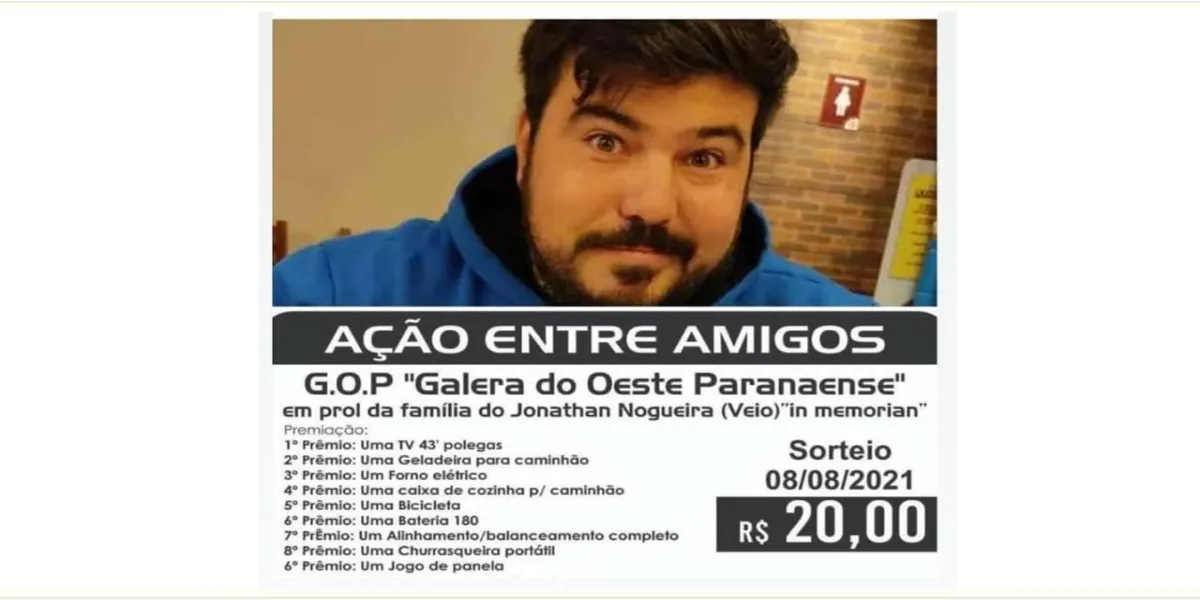 "Infelizmente, após a terrível tragédia que ocorreu com o Jonathan (Véio), a família ficou com muitas dívidas referentes ao caminhão que está financiado e também a seguradora não deu o veículo como Perca Total, por conta disso estamos nos reunindo para fazer uma rifa a fim de ajudar a família. A mãe do Jhonatan continua no hospital, já passou por 3 cirurgias, está com pinos na bacia e coluna e se encontra estável, porém seu marido precisa se descolar todos os dias de Cascavel a Toledo, para acompanhá-la. Então quem puder ajudar de alguma forma, mesmo que com pouco já é uma grande benção. Qualquer valor será bem-vindo".