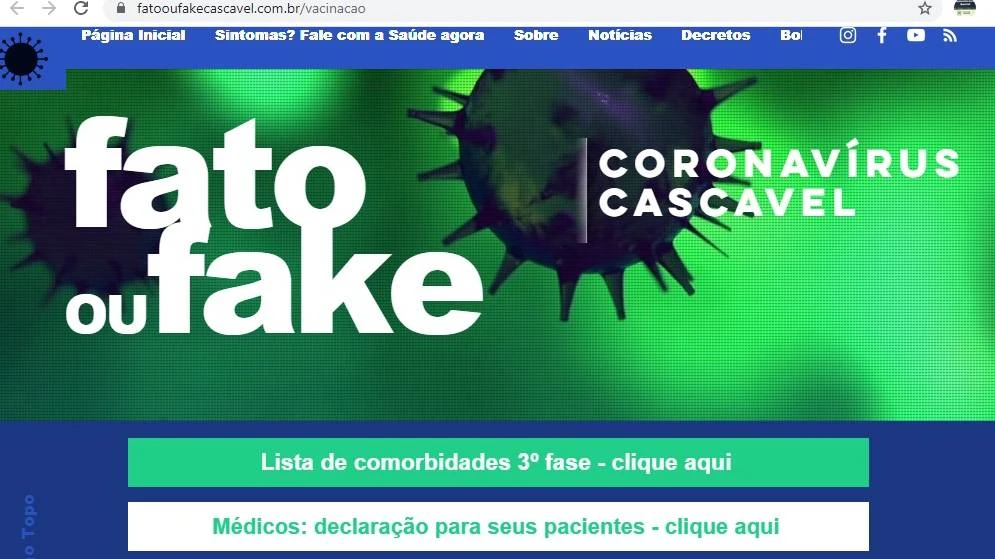 Cascavel, além de trazer os dados habituais no Portal do Município, também mantém atualizado em tempo real todas as informações sobre vacinação em aba exclusiva no site www.fatooufakecascavel.com.br/vacinacao .
