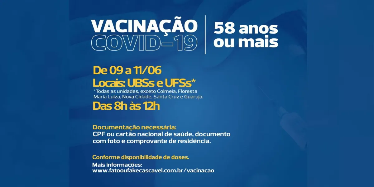 Cascavel vacina pessoas com 58 anos completos ou mais, sem comorbidades, nesta quarta-feira (9) contra a Covid-19.