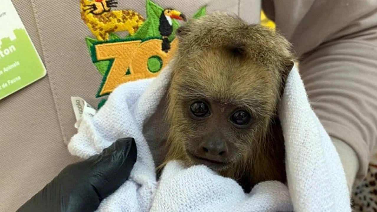 Agora o pequeno é mantido no recinto agarrado a mãe e no convívio de outros macacos da mesma espécie. E o peso do bichinho não chega nem a 1 quilo.