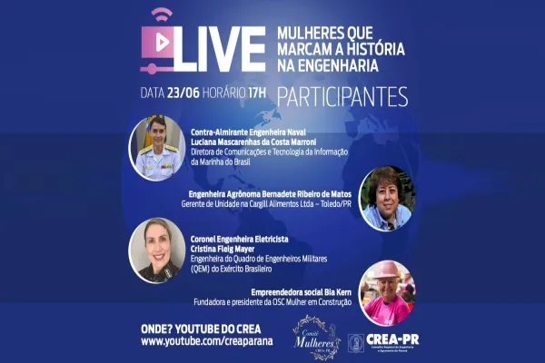 Nesta quarta-feira, dia 23 de junho, comemora-se o Dia Internacional das Mulheres na Engenharia. O Conselho Regional de Engenharia e Agronomia do Paraná (Crea-PR) celebra essa data tão importante com a realização de uma live em seu canal no YouTube. Intitulada “Mulheres que marcam a história na Engenharia”, o encontro virtual terá a presença de três convidadas participando ao vivo e uma que participará com seu depoimento. São elas: Luciana Mascarenhas da Costa Marroni, Contra-Almirante, Engenheira Naval e Diretora de Comunicações e Tecnologia da Informação da Marinha do Brasil; Bernadete Ribeiro de Matos, Engenheira Agrônoma e Gerente da Unidade na Cargill Alimentos Ltda em Toledo, no oeste do Paraná; Bia Kern, empreendedora social, fundadora e presidente da OSC Mulher em Construção; e Cristina Fleig Mayer, Coronel, Engenheira Eletricista do Quadro de Engenheiros Militares (QEM) do Exército Brasileiro (depoimento gravado). A live será aberta pela Engenheira Civil e Coordenadora Estadual do Comitê Mulheres Engenheira Civil Karlize Posanske da Silva e pelo Presidente do Crea-PR Engenheiro Civil Ricardo Rocha de Oliveira, que darão as boas-vindas.