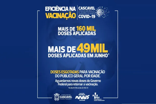 O Programa Municipal de Imunizações (PMI), da Secretaria de Saúde de Cascavel (Sesau), informa que devido à alta adesão à vacinação contra a Covid-19, do público geral sem comorbidades, a aplicação está temporariamente suspensa.
