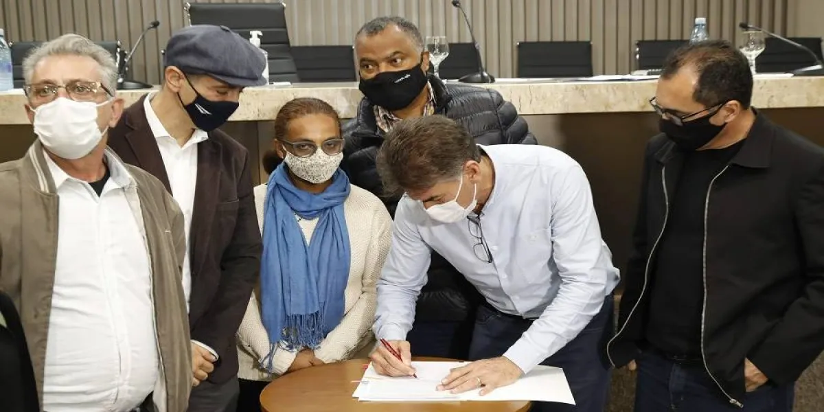 O prefeito Leonaldo Paranhos sancionou, nesta quarta-feira (23), a lei aprovada pela Câmara de Vereadores que permite a cessão de uso, pela Secretaria de Estado da Educação (Seed), da área da Agrotec para a implantação de uma Escola de Inovação Agrícola. A assinatura aconteceu durante encontro na Associação dos Municípios do Oeste do Paraná (Amop) com a participação do secretário estadual, Renato Feder.