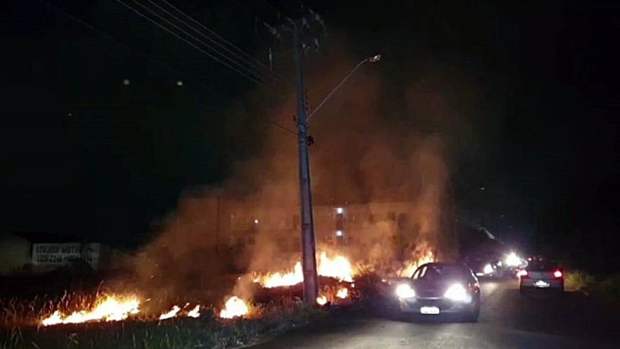 De acordo com populares, ocorreu um estouro e em seguida viram o fogo no poste. As chamas se espalharam rapidamente na vegetação...