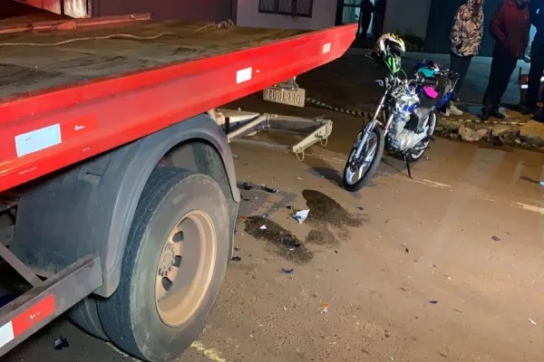 Com o forte impacto, o motociclista acabou batendo fortemente com a cabeça na roda do caminhão, e o carona passou por cima do veículo.