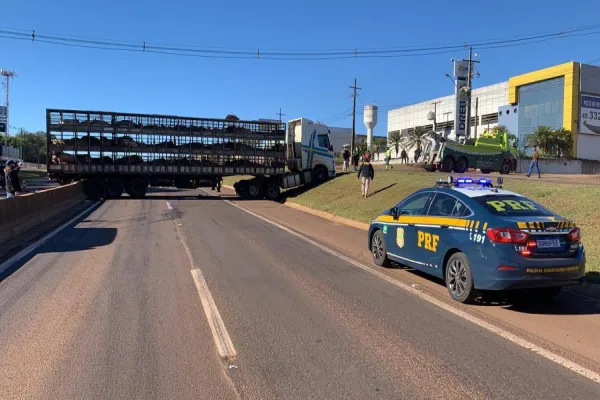 Um caminhão carregado com suínos ficou atravessado na rodovia BR--277, na manhã desta sexta-feira (02), em Cascavel.