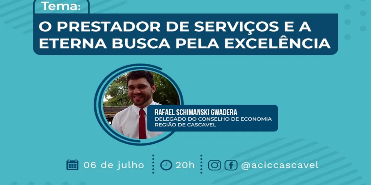 O delegado do Conselho de Economia Região de Cascavel, Rafael Schimanski Guadera, é o convidado da Live Especial Acic da noite da próxima terça-feira, 6 de julho. A transmissão terá início às 20h pelos canais Acic Cascavel no Facebook e Youtube.