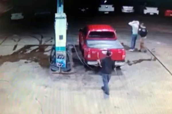 Nas imagens é possível ver uma caminhonete vermelha chegando para abastecer, momento em que a equipe policial chega ao local e efetua a abordagem.
