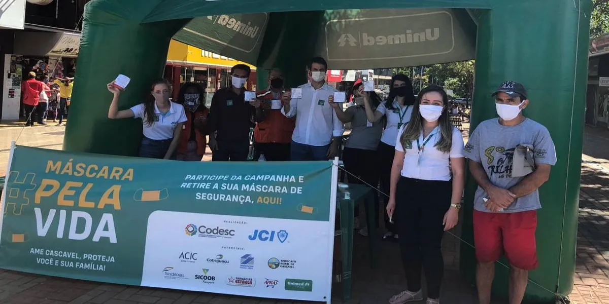 No combate à Covid-19, mais de quatro mil máscaras de pano já foram distribuídas na ação “Máscaras pela Vida”, que começou em 20 de abril e é patrocinada pela Unimed Cascavel. Na segunda-feira (27), voluntárias da cooperativa de saúde estiveram na Travessa Padre Champagnat, no centro da cidade, em uma tenda montada pela Unimed, ao lado de outras empresas e entidades participantes. A iniciativa é do Conselho de Desenvolvimento Econômico Sustentável de Cascavel (Codesc).