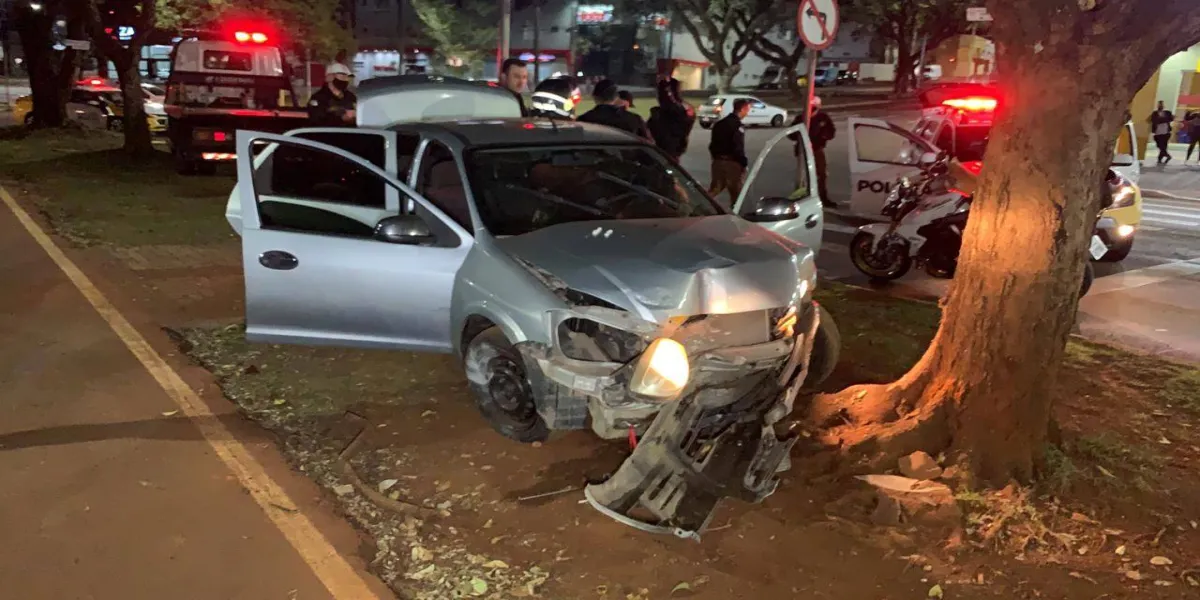 Após perseguição, suspeito colide carro contra árvore na Av. Brasil e acaba detido pela PM