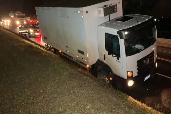 Um caminhão baú caiu na canaleta de escoamento de água na noite desta quinta-feira (15), na BR-277, em Cascavel.
