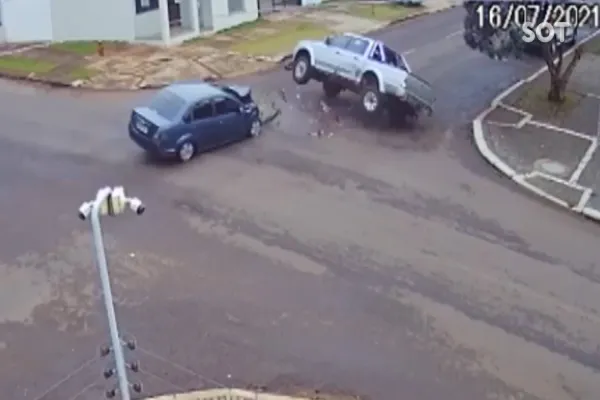 Nas imagens, é possível ver o momento exato em que a caminhonete avança a preferencial e é atingida pelo carro. Com o forte impacto, a L200 roda na pista, tombando na sequencia.