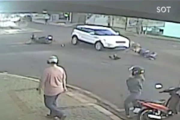 Nas imagens é possível ver o momento em que as duas ocupantes da moto são ejetadas por cima do capô do carro e na sequência elas caem do outro lado via, com a força da batida.