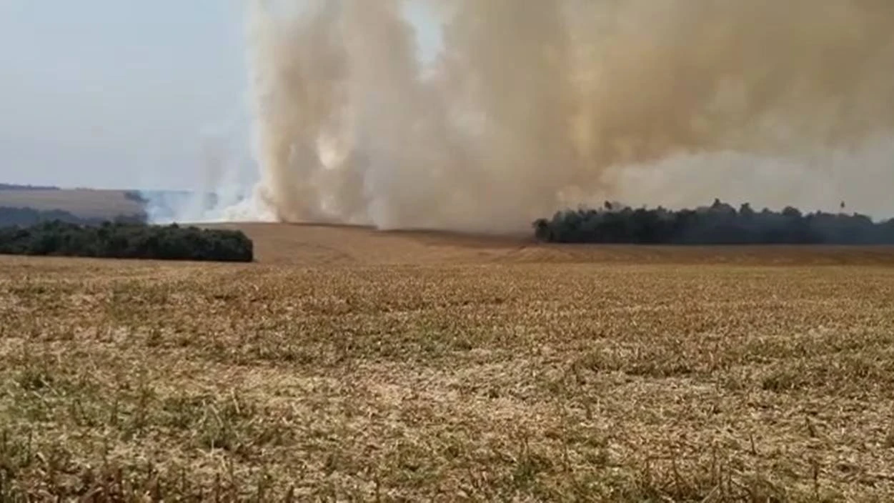 A tarde começa intensa para o Corpo de Bombeiros de Cascavel, por conta do registro de mais um incêndio de grandes proporções, desta vez em uma área com palhada já colhida de milho, no distrito de Sede Alvorada, em Cascavel.
