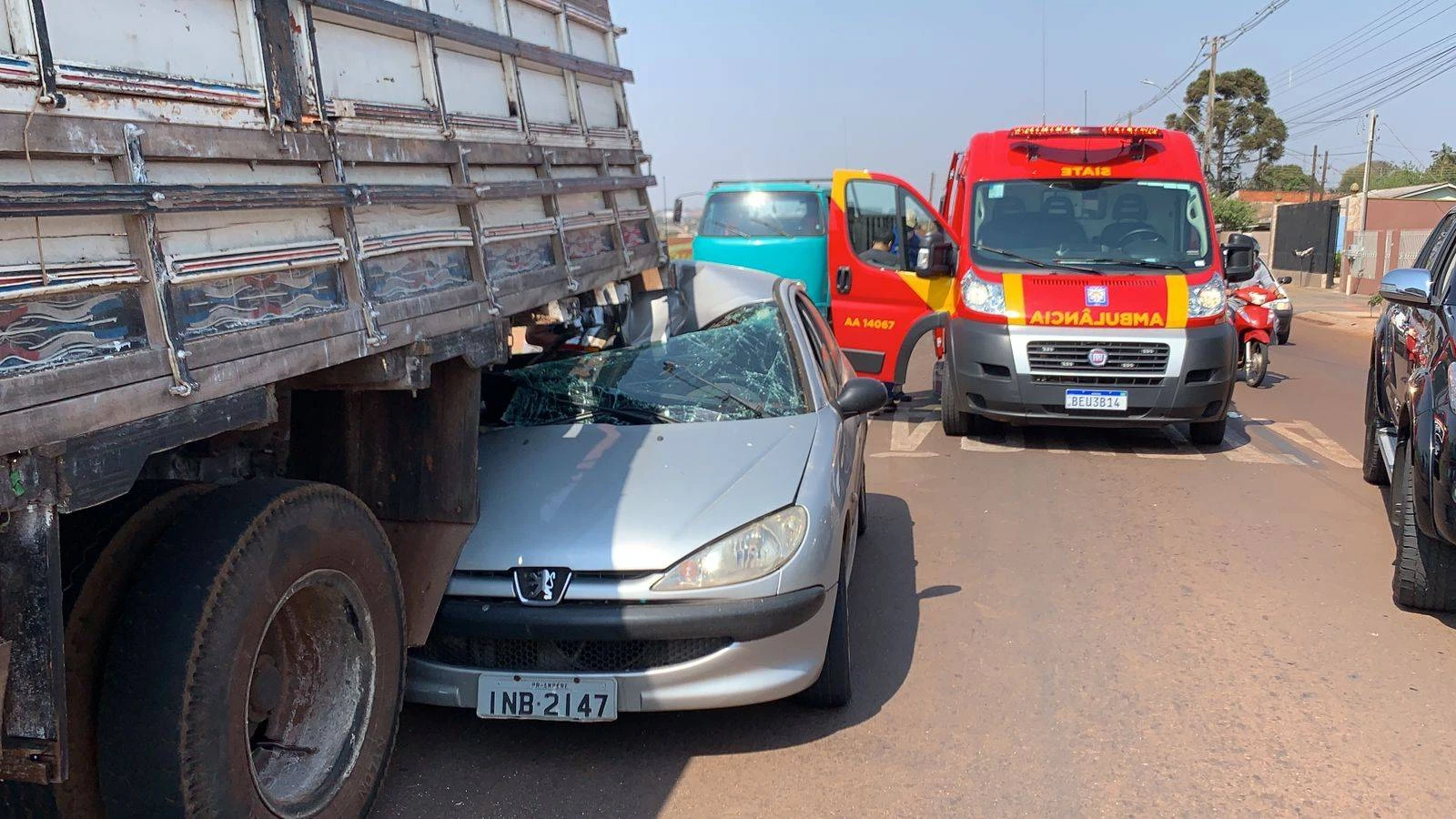 Automóvel para de baixo de caminhão após colisão na Avenida das Pombas no Bairro Clarito