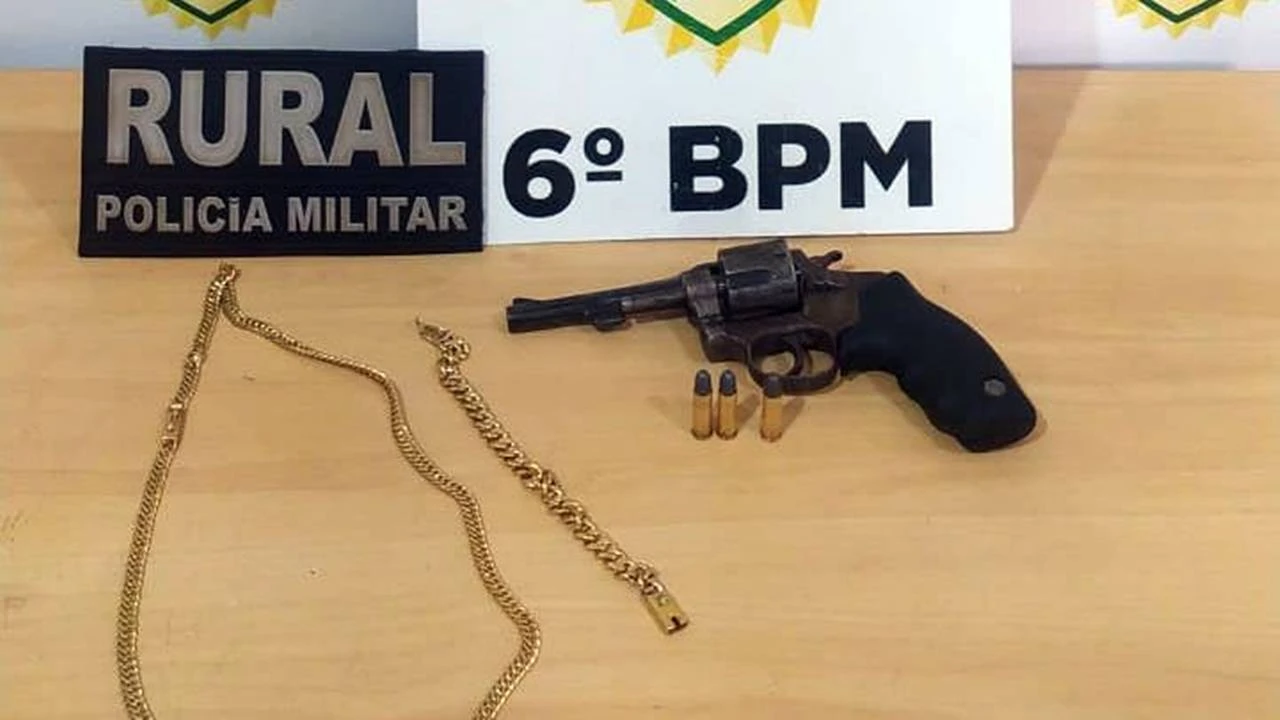No local, a equipe da Patrulha Rural juntamente com a viatura da UPS Santa Cruz, chegaram no estabelecimento e os indivíduos ainda estariam no interior do estabelecimento. Dois indivíduos foram encontrados em um cômodo nos fundos do barracão e a arma localizada era um revólver marca Taurus cal. 32 com 3 munições.