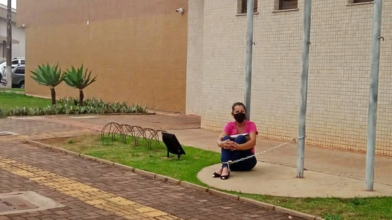 Mulher se acorrenta em frente ao Fórum de Toledo para pedir soltura do filho