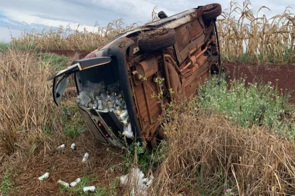 Um utilitário Renault carregado de latas de cerveja capotou na rodovia PR 491, trecho que liga os municípios de Marechal Rondon a Nova Santa Rosa, proximidades da Polícia Rodoviária Estadual de Marechal, por volta das 09h40 da manhã desta sexta-feira (27).