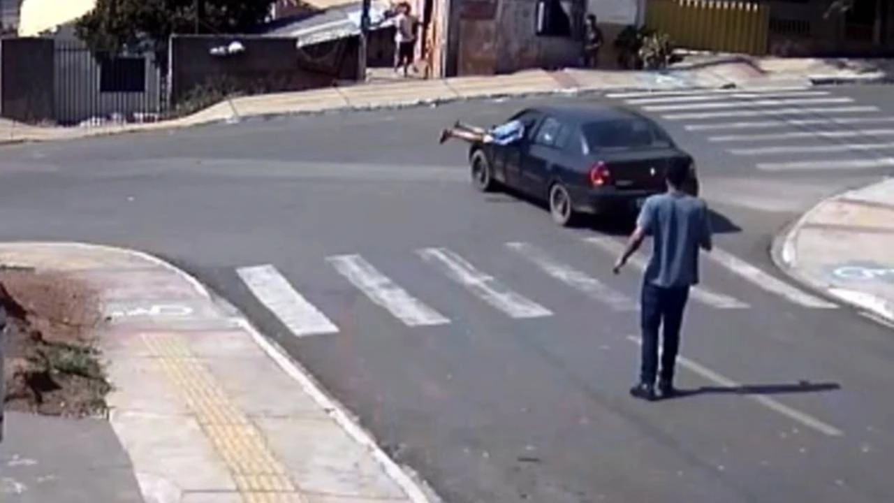 Uma câmera de segurança registrou o momento em que um homem pulou dentro de um carro sem freio em movimento e conseguiu parar o veículo antes de casas serem atingidas em Castro, nos Campos Gerais do Paraná. O caso aconteceu no domingo (22).