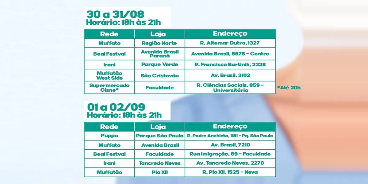 Já nos pontos extras instalados nos supermercados continua aplicação até quinta-feira, dia 2 de setembro, conforme a programação.