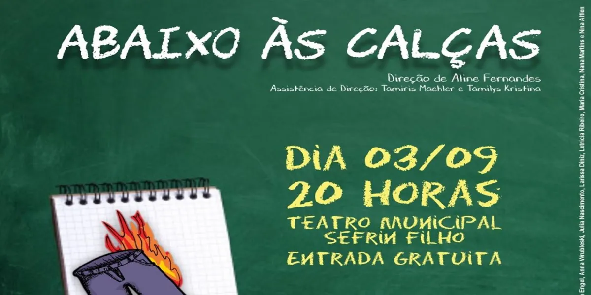 A turma do curso de teatro de nível intermediário Programa Cultura em Ação estreará nesta sexta-feira (3), às 20h, no Teatro Municipal Sefrin Filho o espetáculo “Abaixo às calças”. Com entrada gratuita, a peça, dirigida pela professora de teatro do programa, Aline Fernandes, trata sobre igualdade e discriminação no colégio, uma realidade entre os adolescentes que frequentam o ambiente colegial.