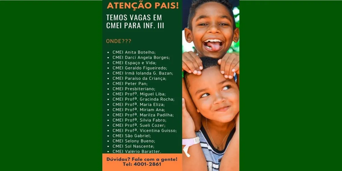A Secretaria Municipal de Educação informa que dispõe de vagas para turmas do Infantil III (crianças nascidas de 01/04/2017 a 31/03/2018) em 20 Cmeis da Rede Municipal.