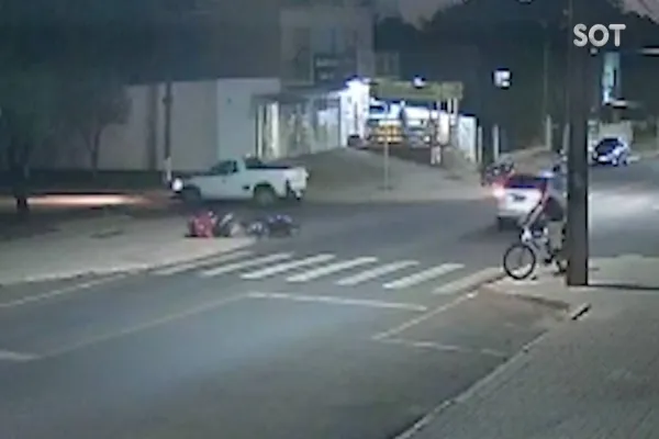 Uma câmera de segurança registrou na noite desta sexta-feira (24), uma forte colisão envolvendo carro e moto no Bairro Cascavel Velho.