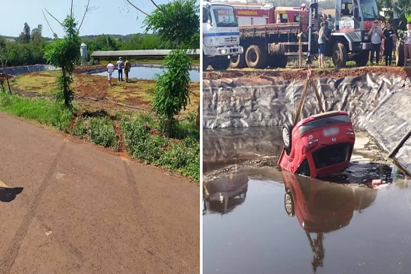 Segundo informações, o condutor de um veículo Pálio Weekend não conseguiu frear a tempo em um cruzamento, sendo que o carro estourou uma cerca, avançou em uma propriedade, caindo dentro de uma esterqueira de aproximadamente cinco metros de profundidade.