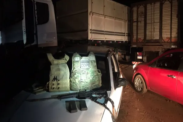 Na noite deste domingo (26/09), os policiais monitoravam o distrito de São Miguelzinho, quando identificaram um caminhão entrando em uma chácara. Após acompanhar o veículo e monitorar o movimento no interior da propriedade, avistaram diversas pessoas transportando caixas de cigarros estrangeiros além de caminhões e carros. Desta forma, decidiram por realizar abordagem no local, momento que diversos indivíduos empreenderam fuga pela mata. Um indivíduo, que realizava a segurança do local, portava um fuzil, calibre 7.62, com dois carregadores, foi algemado e preso.