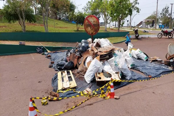 Os entulhos recolhidos estão expostos próximo ao palco ao lado do Lago Municipal e serão triados para reciclagem.