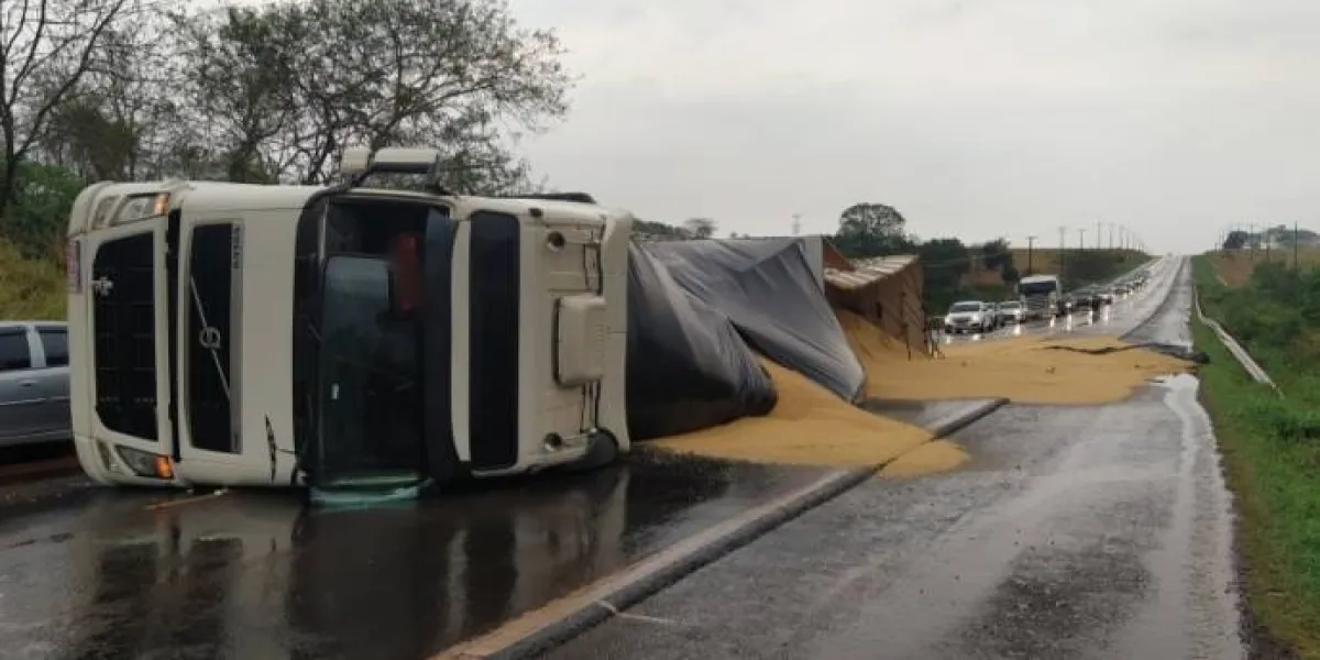Conforme apurado no local pelo Ponto da Notícia, uma carreta bitrem, que seguia para Paranaguá, tombou na estrada no distrito de Novo Horizonte. O bitrem ficou sobre a pista e a carga de farelo de soja espalhada. A situação aconteceu por volta das 9h30min.