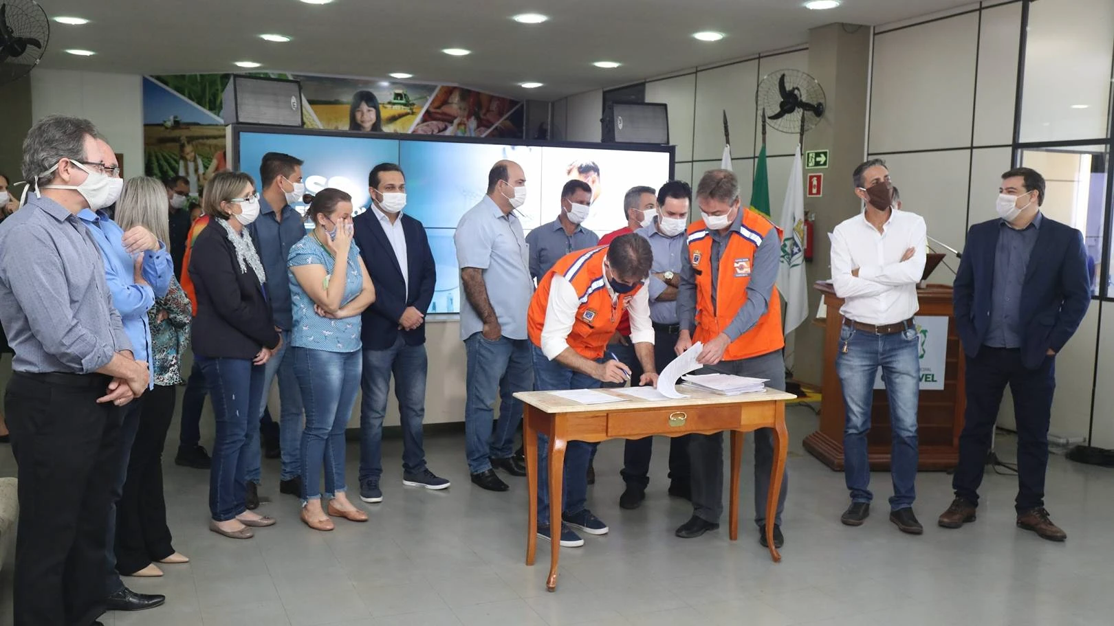 O prefeito de Cascavel, Leonaldo Paranhos, e o secretário de Finanças, Renato Segalla, lançaram na manhã desta quarta-feira (8) um pacote econômico que tem como objetivo estimular a retomada da economia local, afetada pela pandemia de coronavírus (Covid-19). Vários tributos municipais tiveram o prazo prorrogado. De acordo com Segalla, a medida foi tomada porque o momento requer sensibilidade do poder público.