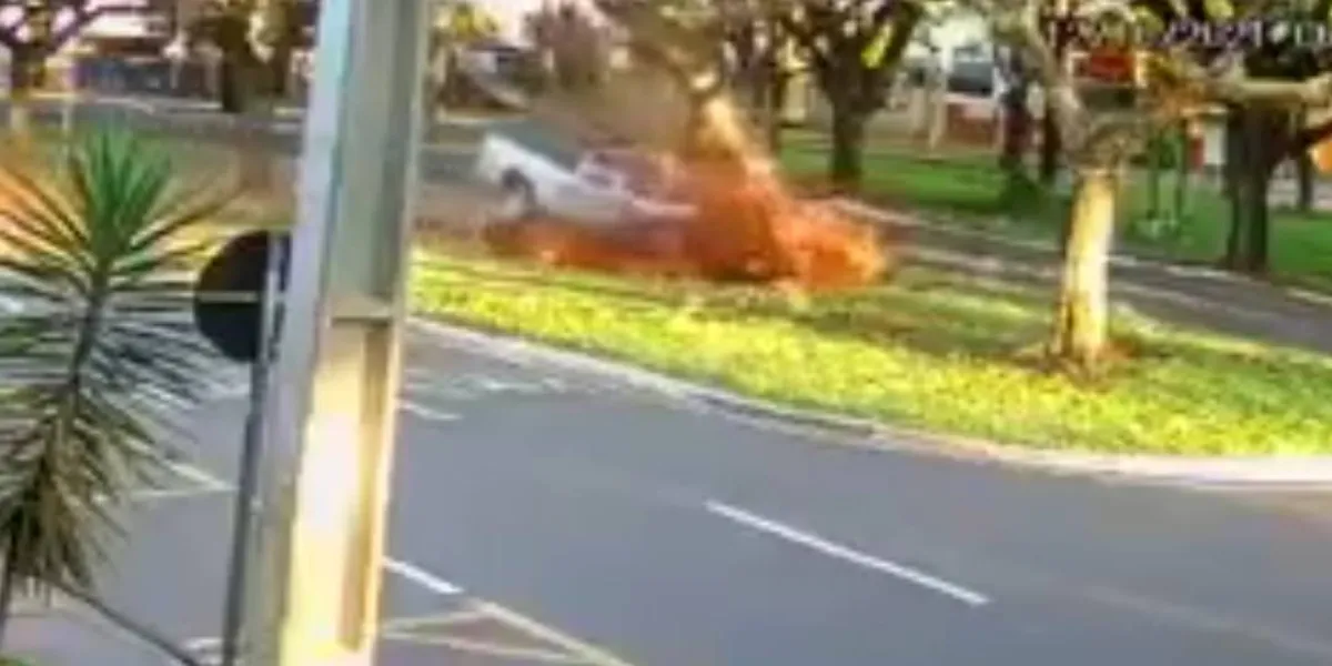 Uma câmera de segurança registrou um acidente impressionante na avenida Laguna próximo ao Parque do Ingá, em Maringá, na manhã desta terça-feira (12).