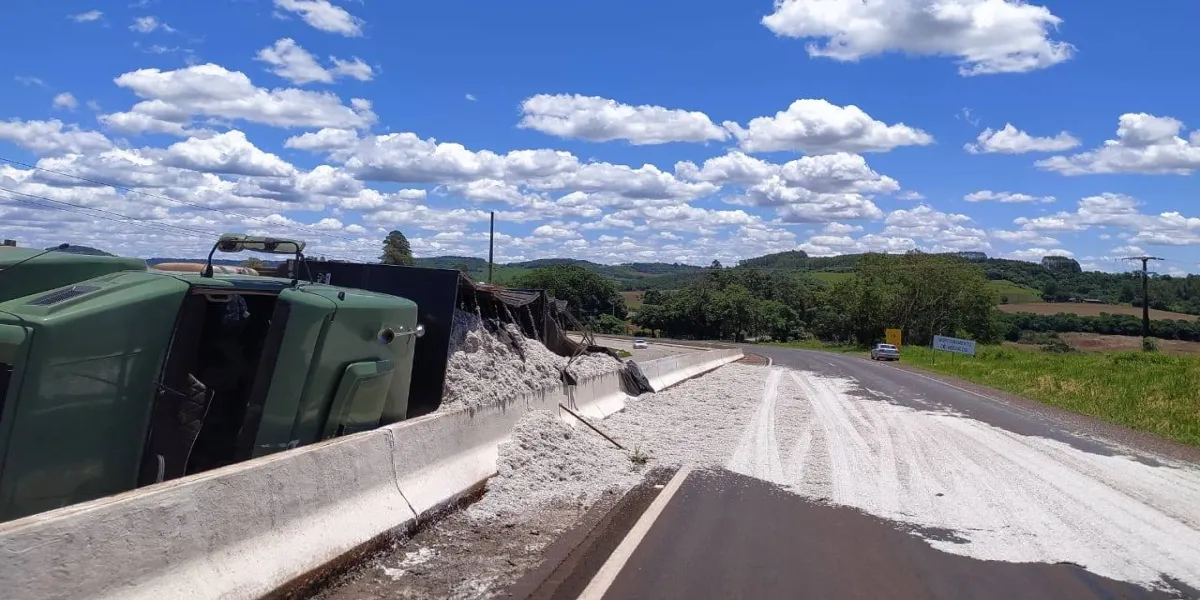 O veiculo ao se aproximar de uma curva no KM 175, acabou tombando, espalhando a carga de sementes de algodão sobre a via.