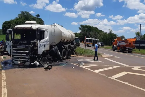 Ônibus escolar e caminhão-tanque se envolvem em forte colisão na BR-277 em Guaraniaçu