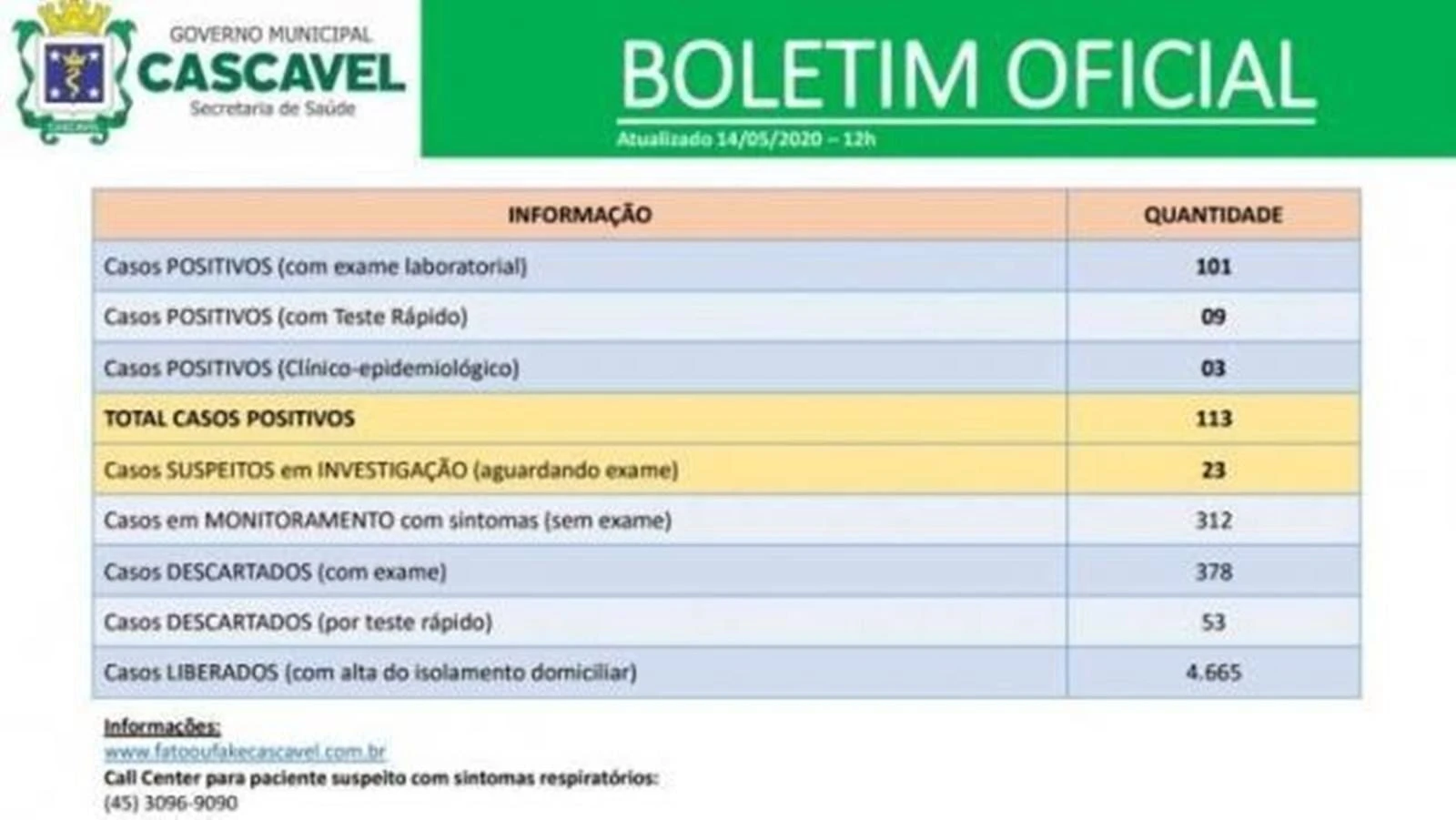 O boletim divulgado pela Secretaria Municipal de Saúde, nesta quinta-feira (14), aponta que Cascavel conta com cinco novos casos confirmados de Covid-19, doença causada pelo novo coronavírus (Sarsc-Cov-2). Ao todo, são 113 confirmações na cidade e quatro mortes em decorrência da doença.