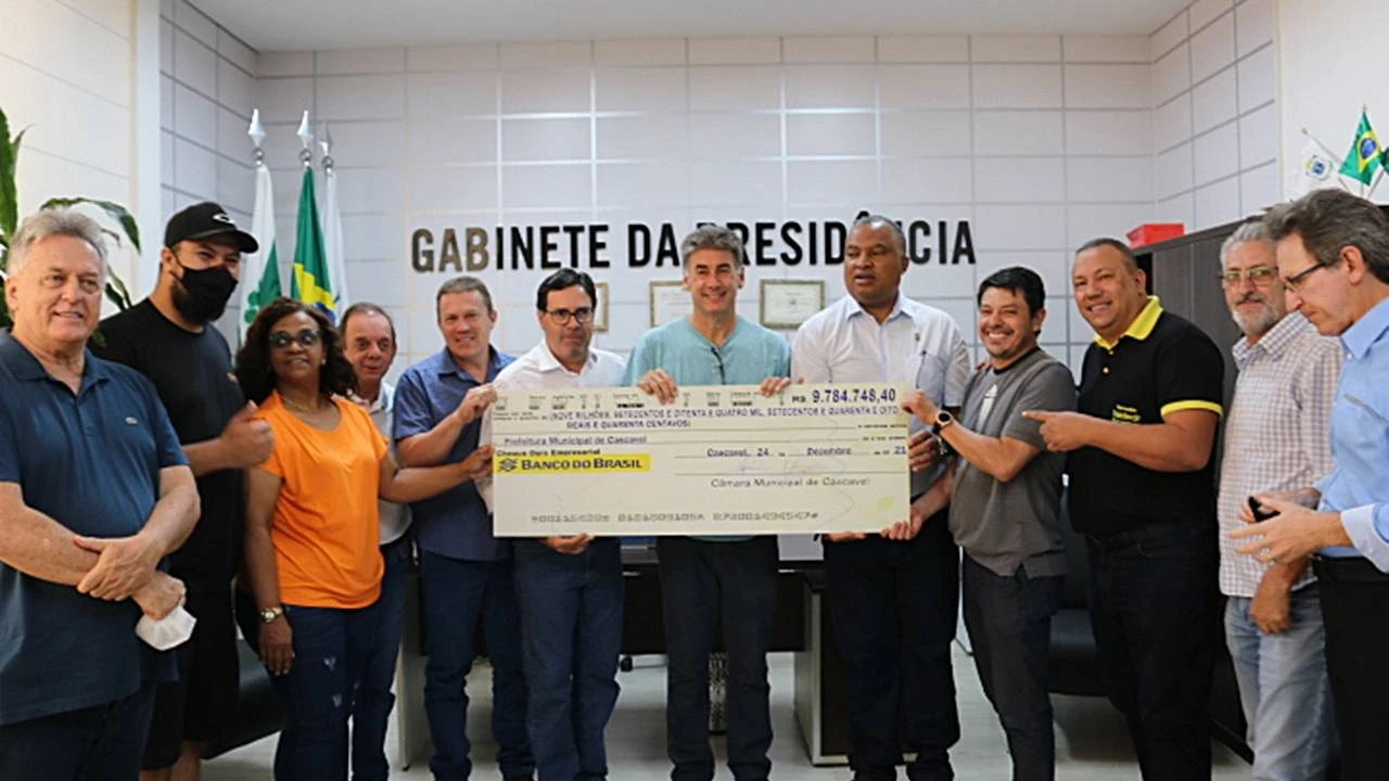 A economia gerada pelo Legislativo de Cascavel ao longo de ano que chega ao fim, possibilitou à devolução de R$ 9.784.748,40 ao Município. O cheque simbólico foi entregue na manhã desta sexta-feira (24) ao prefeito Leonaldo Paranhos pelo presidente da Câmara de Vereadores de Cascavel, Alécio Espínola. Vários vereadores estiveram no gabinete da presidência para acompanhar o ato.
