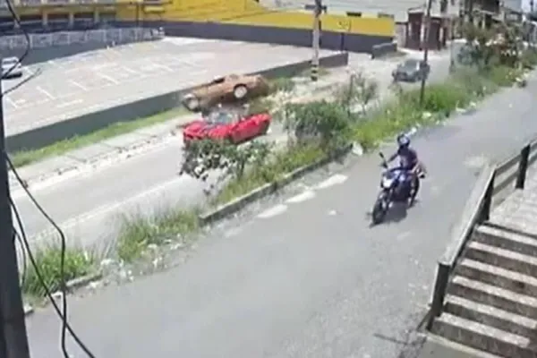 Em vídeo de câmera de segurança, é possível ver o Chevette descendo uma rua sem saída em alta velocidade e atingindo em cheio o Camaro....