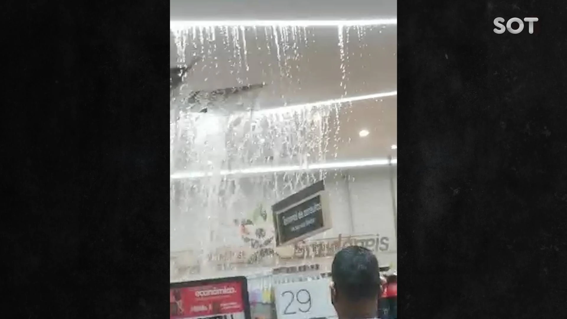 Parte da estrutura acabou cedendo, vindo boa parte do fluxo de água entrar e alagar o comercio. Populares registraram toda a ação.