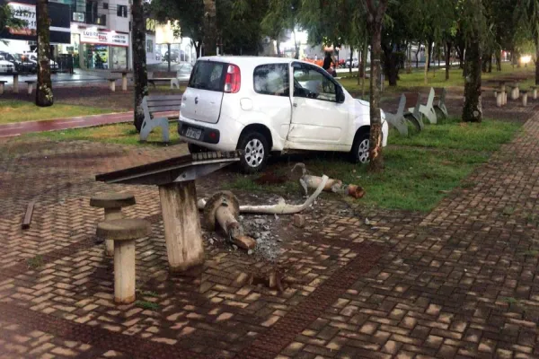 Com o impacto uma mesa de xadrez feita de concreto, acabou quebrando com a colisão. No local ninguém ficou ferido, apenas danos materiais.