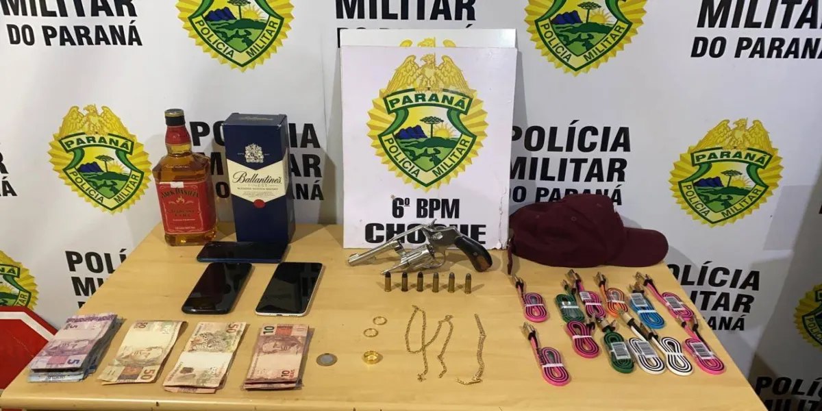 No interior do veículo foram encontradas bebidas, jóias, acessórios para celular e a quantia de R$376,00 em espécie. Quando realizada buscas no trajeto percorrido pelo veículo em fuga, foi encontrado um revólver calibre .38 carregado com 06 munições e uma touca balaclava.
