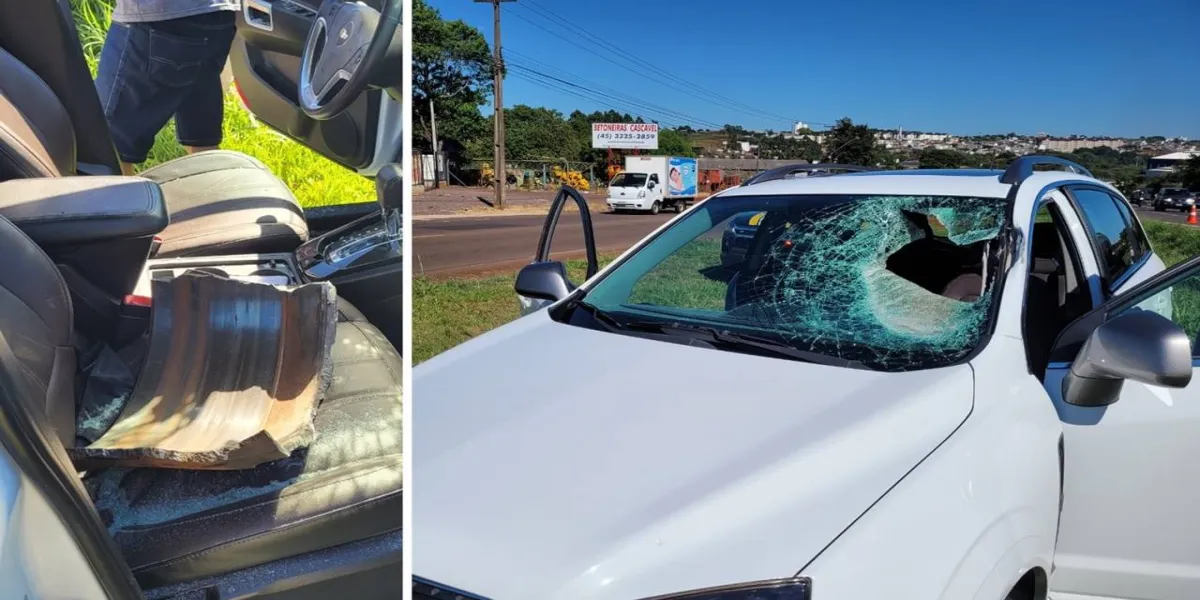 Um motorista de 32 anos sofreu ferimentos leves na manhã deste sábado (22), após o seu veiculo ser atingido por uma peça de caminhão na BR-277 em Cascavel.