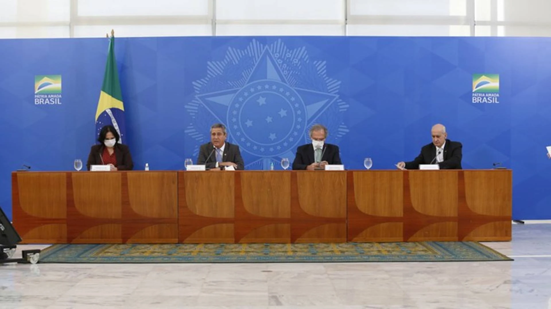 Participaram da coletiva de imprensa, nesta sexta-feira (15), no Palácio do Planalto, além do ministro-chefe da Casa Civil general Braga Netto, o ministro-chefe da Secretaria de Governo, Luiz Eduardo Ramos, a ministra do ministério da Mulher, da Família e dos Diretos Humanos, Damares Alves, e o ministro da Economia, Paulo Guedes.