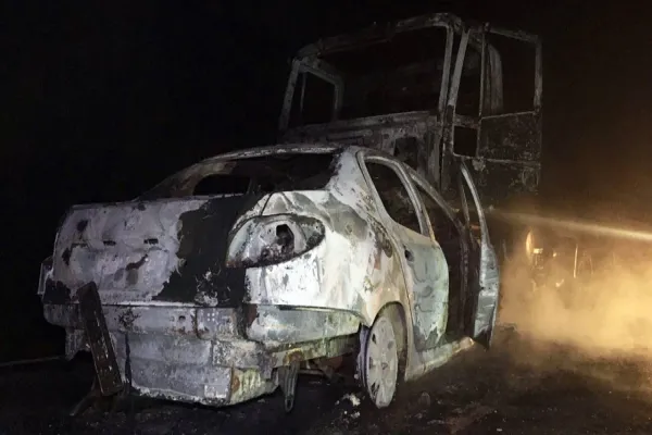 Dois veículos ficaram totalmente destruídos na noite desta quinta-feira (28), após uma colisão seguida de incêndio na PR-180 no distrito de Rio do Salto em Cascavel.