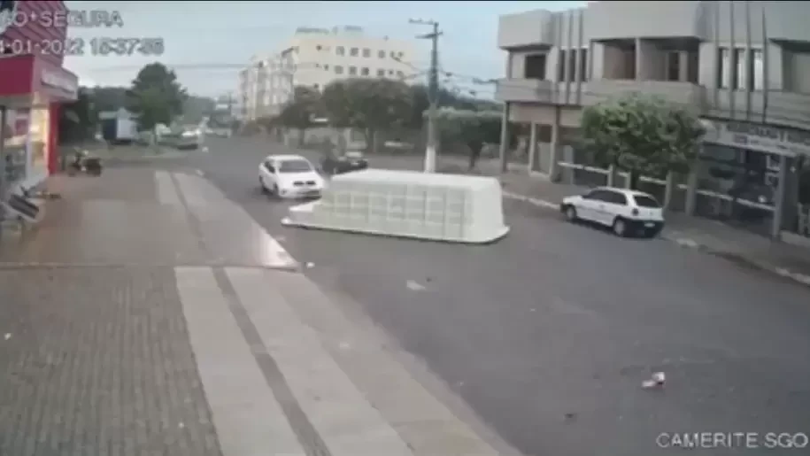 Segundo apuração do G1, a piscina de fibra estava exposta na parte externa de um estabelecimentos de uma avenida, quando uma forte ventania atingiu os arredores da cidade e fez com que ela se deslocasse para o meio da rua.