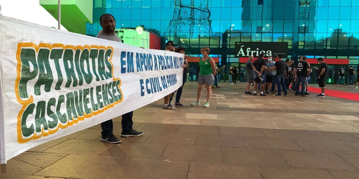 Um grupo de aproximadamente 100 policiais militares da ativa realizaram no final da tarde desta quinta-feira (10), um protesto silencioso em frente ao Teatro Municipal de Cascavel.